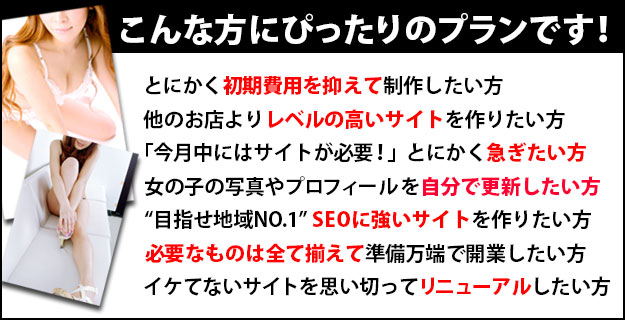 「本気で開業するつもりだ、本気で利益を上げたい」そんなあなたには完全オリジナルでサイトを作ることができる「開業フル装備パック」をお薦めします。ライバルに差をつける、最高品質のデザインに加え、スマホサイト、ロゴ制作、求人用LPまで完備したこれ以上ないフルパック。他のプランと比較しても、集客力は抜き出ています。絶対に後悔しないと自信を持ってお薦めします。もちろん初期費用ゼロ!他社ではマネできない特別なコースです。